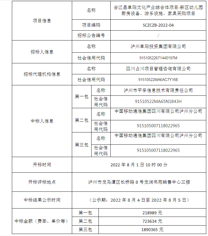 合江縣阜陽文化產(chǎn)業(yè)綜合體項目-新區(qū)幼兒園廚房設(shè)備、游樂設(shè)施、家具采購項目公開招標中標結(jié)果公告