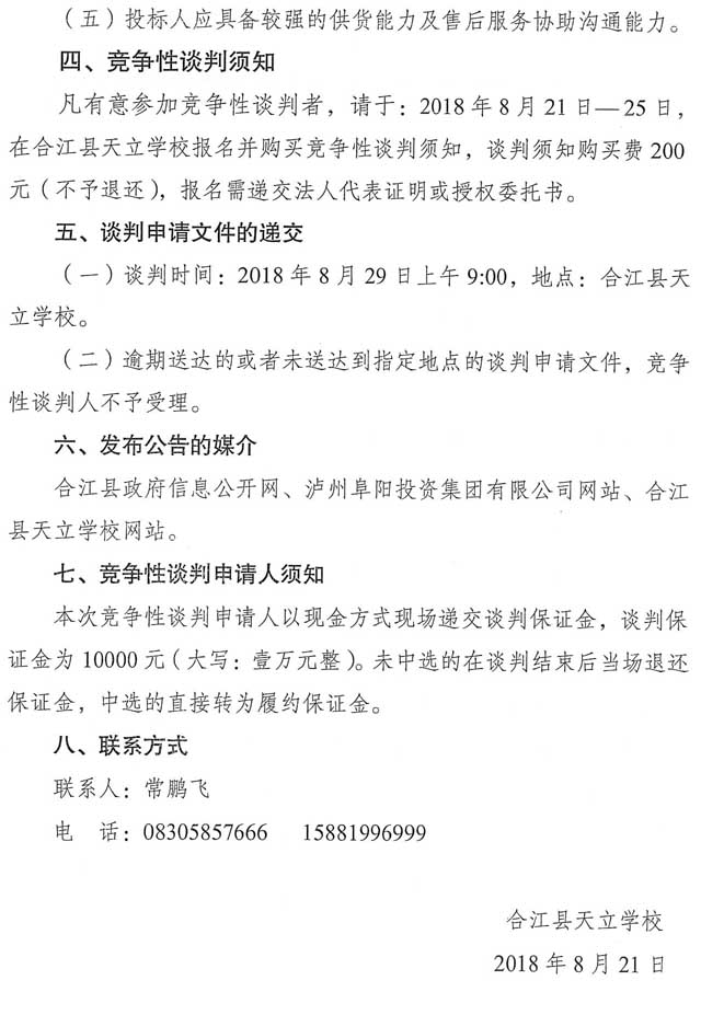 競爭性談判公告:合江縣天立學校食堂大宗食品定點采購項目競爭性談判公告