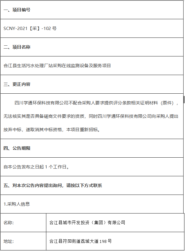 合江縣生活污水處理廠站采購在線監(jiān)測設(shè)備及服務(wù)項目競爭性磋商結(jié)果更正公告