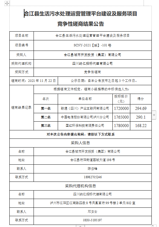 合江縣生活污水處理運(yùn)營(yíng)管理平臺(tái)建設(shè)及服務(wù)項(xiàng)目競(jìng)爭(zhēng)性磋商結(jié)果公告