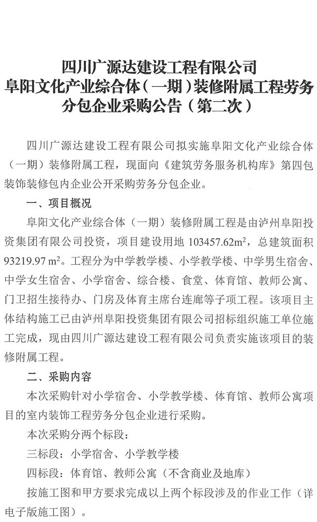 采購(gòu)公告:四川廣源達(dá)建設(shè)工程有限公司阜陽(yáng)文化產(chǎn)業(yè)綜合體(一期)裝修附屬工程勞務(wù)分包企業(yè)采購(gòu)公告(第二次)